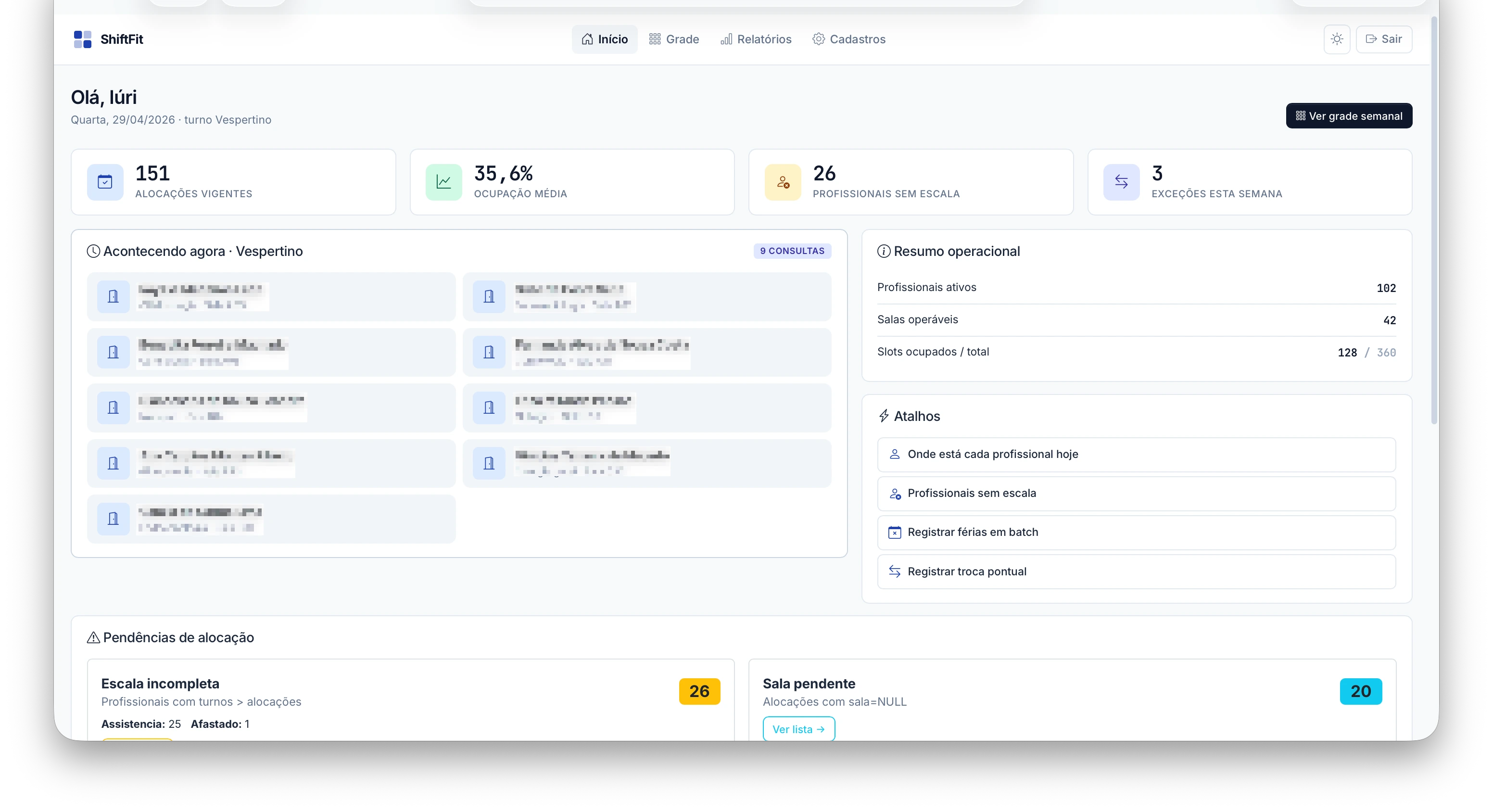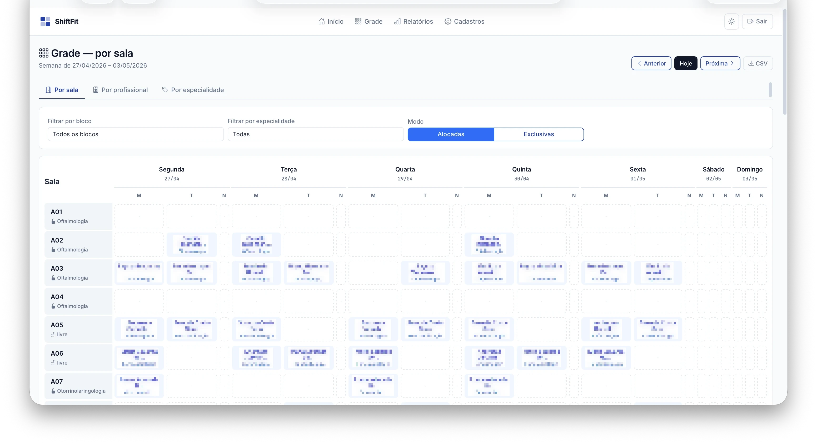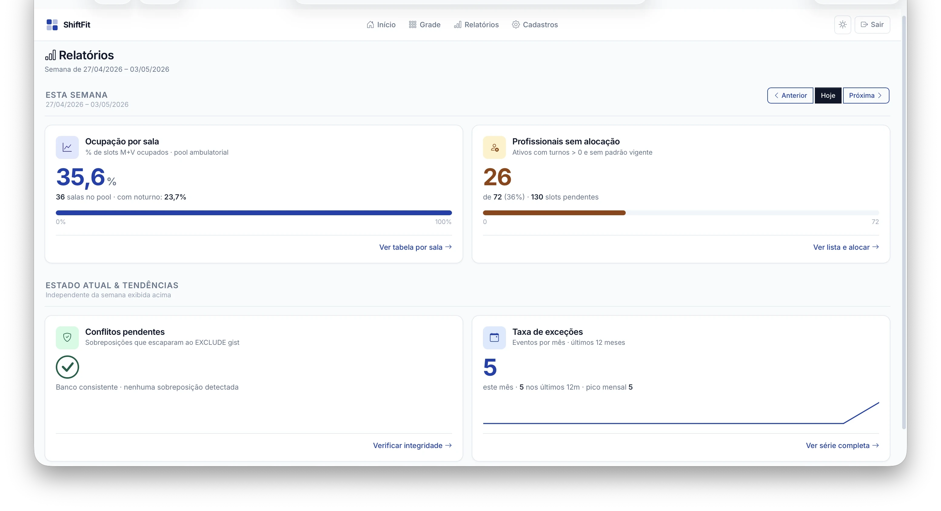 Três perspectivas da grade — por sala, por profissional e por especialidade — para que cada papel operacional veja o que importa pra ele. Cinco relatórios cobrem o cotidiano de gestão: ocupação por sala, profissionais sem alocação completa, salas subutilizadas, taxa de exceções da semana, conflitos pendentes.